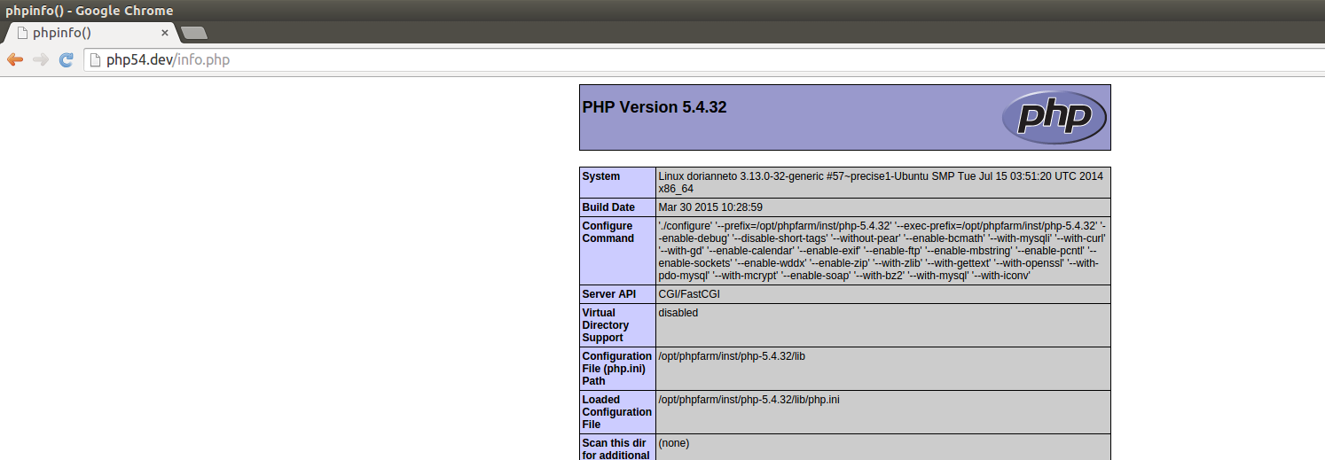 Onde na saída de cada comando deverá ser informado a versão do php(no nosso caso é a 5.4.32) e o Server API(cli e cgi-fcgi respectivamente).